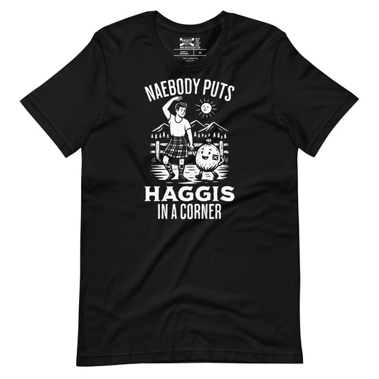 Funny Scottish T-Shirt ā Naebody Puts Haggis In A Corner Premium Tee